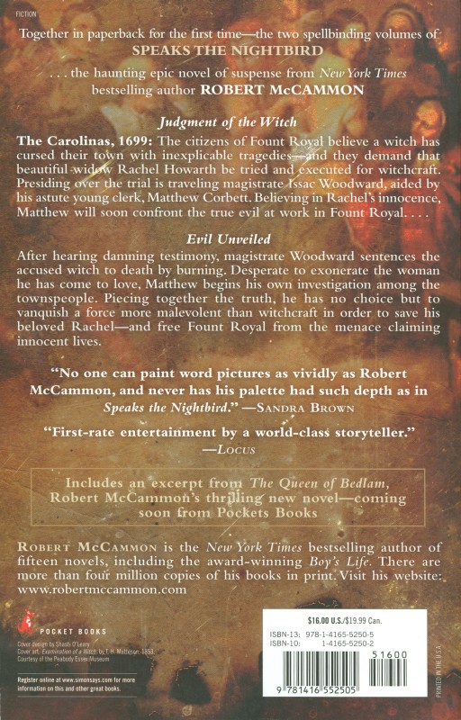 Speaks the Nightbird Trade paperback (rear) Pocket Books, 2007 (Final cover)
