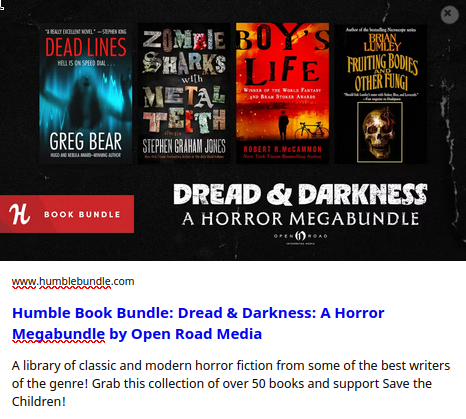 There’s a new “Dread & Darkness” horror megabundle at Humble Bundle consisting of 52 ebooks. Included are the Matthew Corbett series (minus The Queen of Bedlam, since Open Road doesn’t publish that), Stinger, They Thirst, The Wolf’s Hour, Boy’s Life, and Swan Song, along with books by Richard Matheson, Stephen Graham Jones, Robert Bloch, and others. You can get all 52 ebooks for $18 (or more, if you want).
